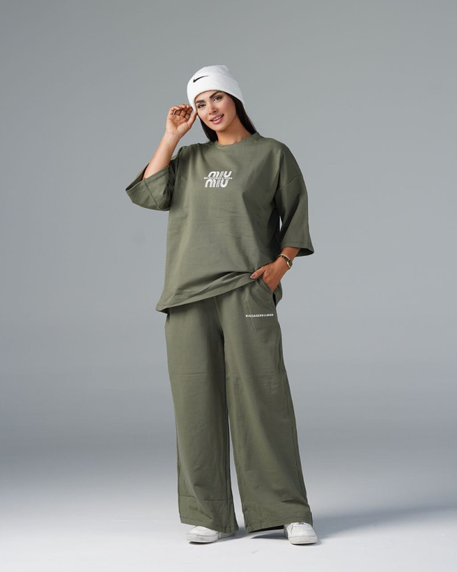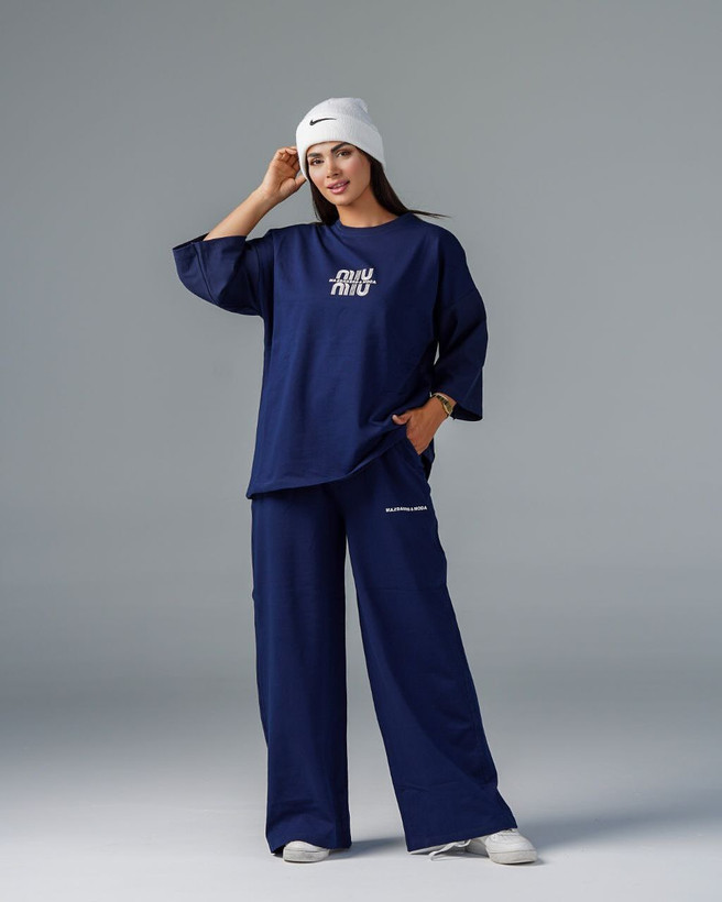 ست اسپرت شامل تیشرت آستین بلند با لوگوی برجسته MIU MIU و شلوار لش با چاپ برجسته بالای ران. راحتی بینظیر و آزادی حرکت را به شما هدیه میکند.